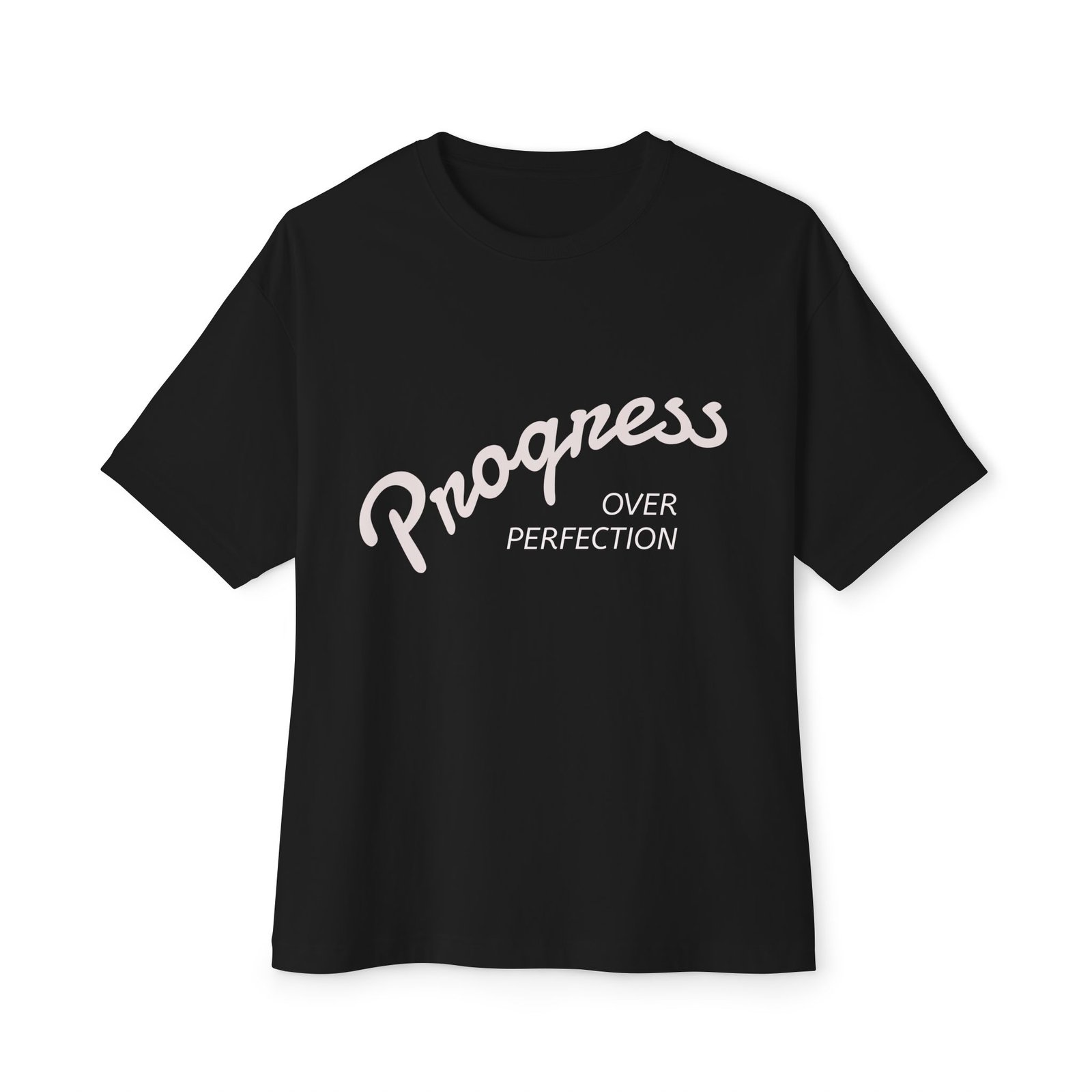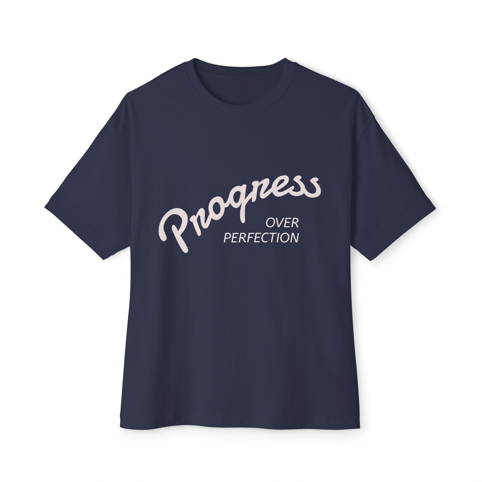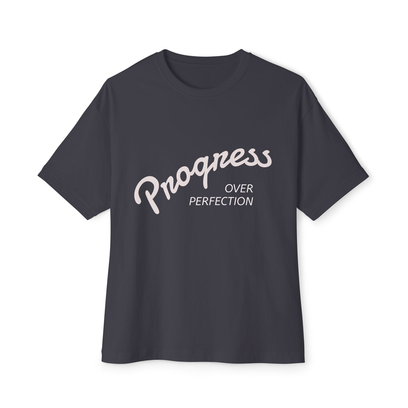 Soft, roomy, and quietly confident — this oversized boxy tee carries a simple reminder across the chest: Progress over Perfection. The relaxed silhouette and dropped shoulders create an easy, lived-in look that layers or stands alone. Wear it on slow mornings, during creative sprints, or after a long day to anchor yourself in steady forward motion. The muted script feels personal, not loud — a subtle statement for people who value growth, practice, and authenticity.