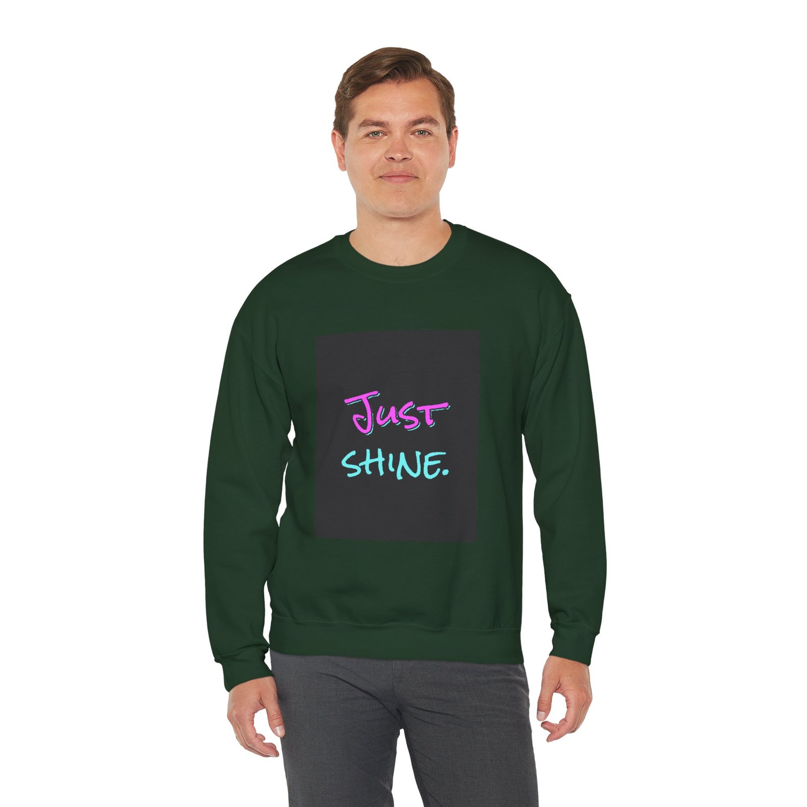 Soft, warm, and quietly confident — this crewneck wraps you in comfort while letting a small, colorful message do the talking. The black sweatshirt gives the neon hand-lettered “Just SHINE.” artwork room to glow, like a little reminder you can reach for on cloudy days. It sits with a relaxed, classic cut that layers easily over tees or under jackets. Wear it to late-night drives, low-key meetups, chilly mornings at the studio, or when you need a gentle nudge to show up and be yourself.
