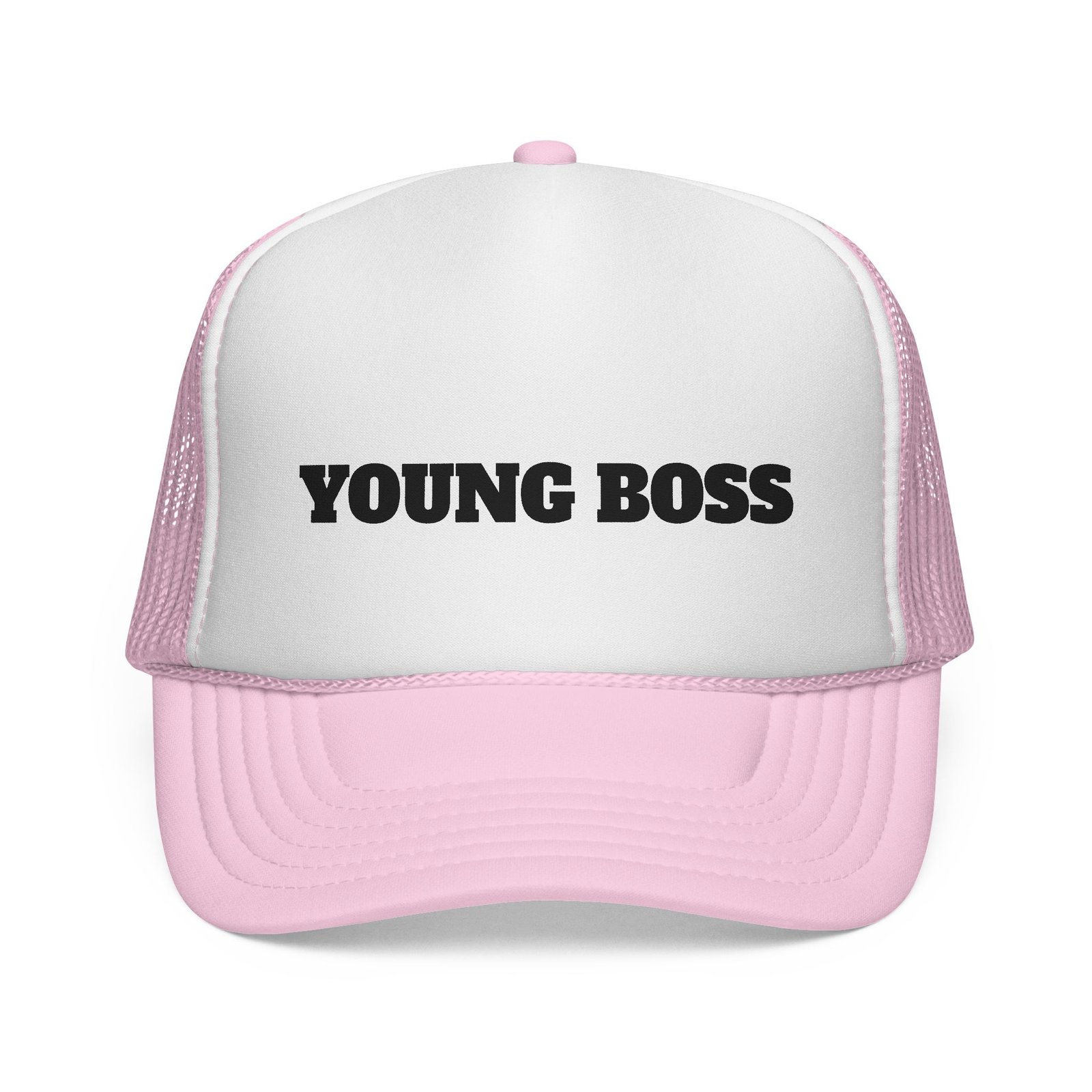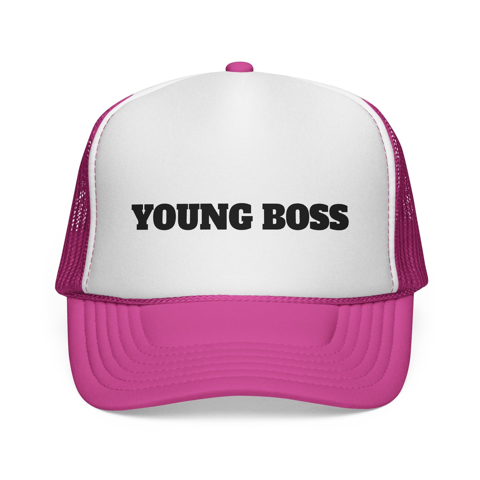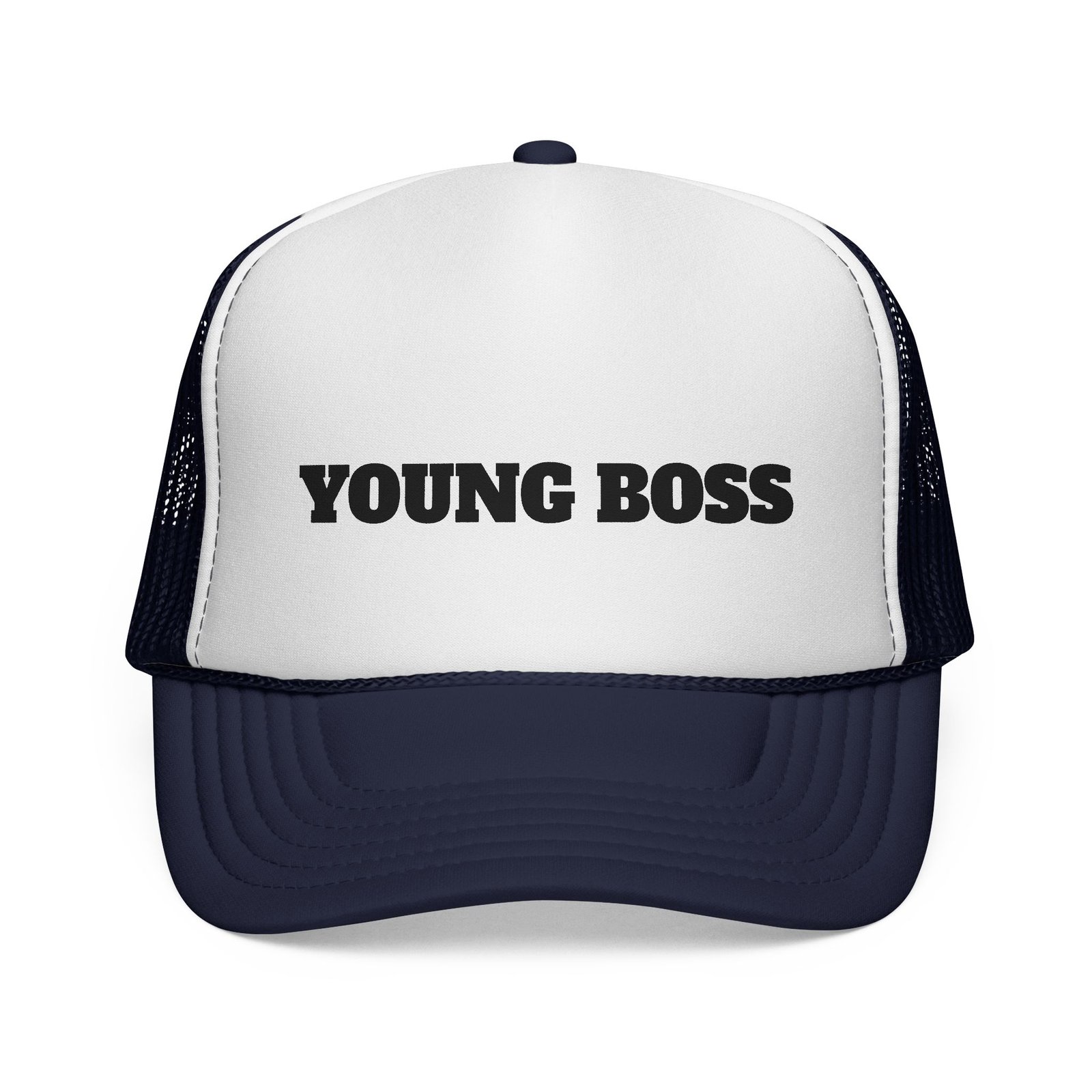 This trucker cap wears confidence lightly. The sculpted foam front holds a bold “young boss” face design that reads playful, sharp, and unapologetic — the kind of look that opens conversations before you say a word.