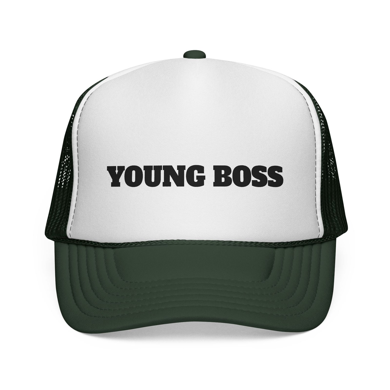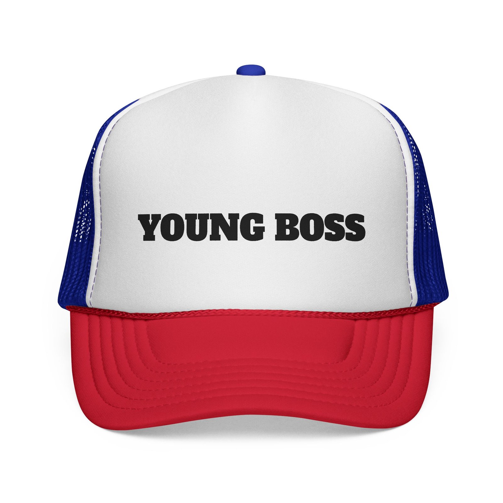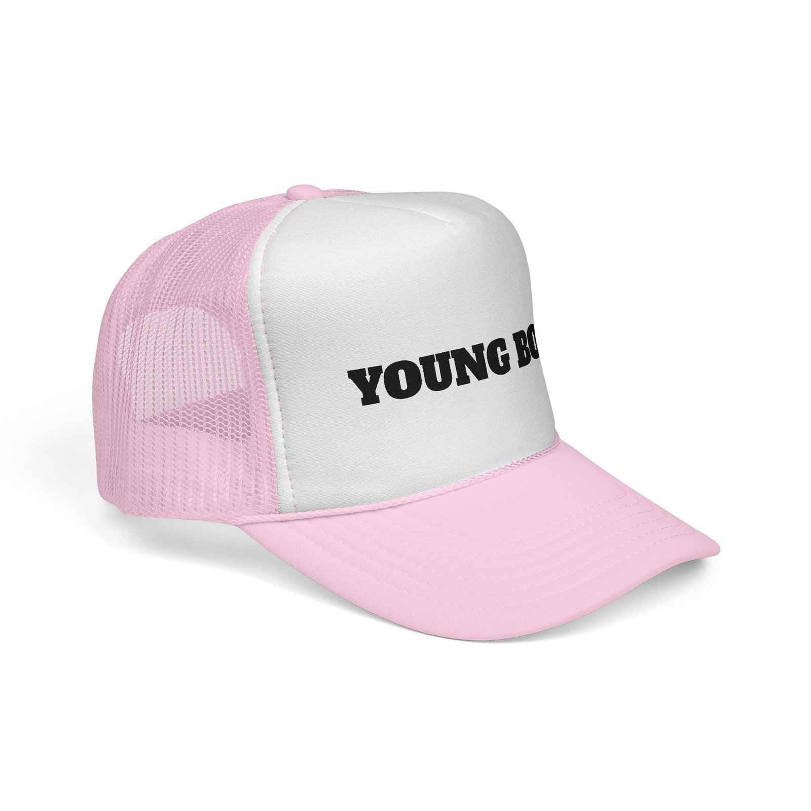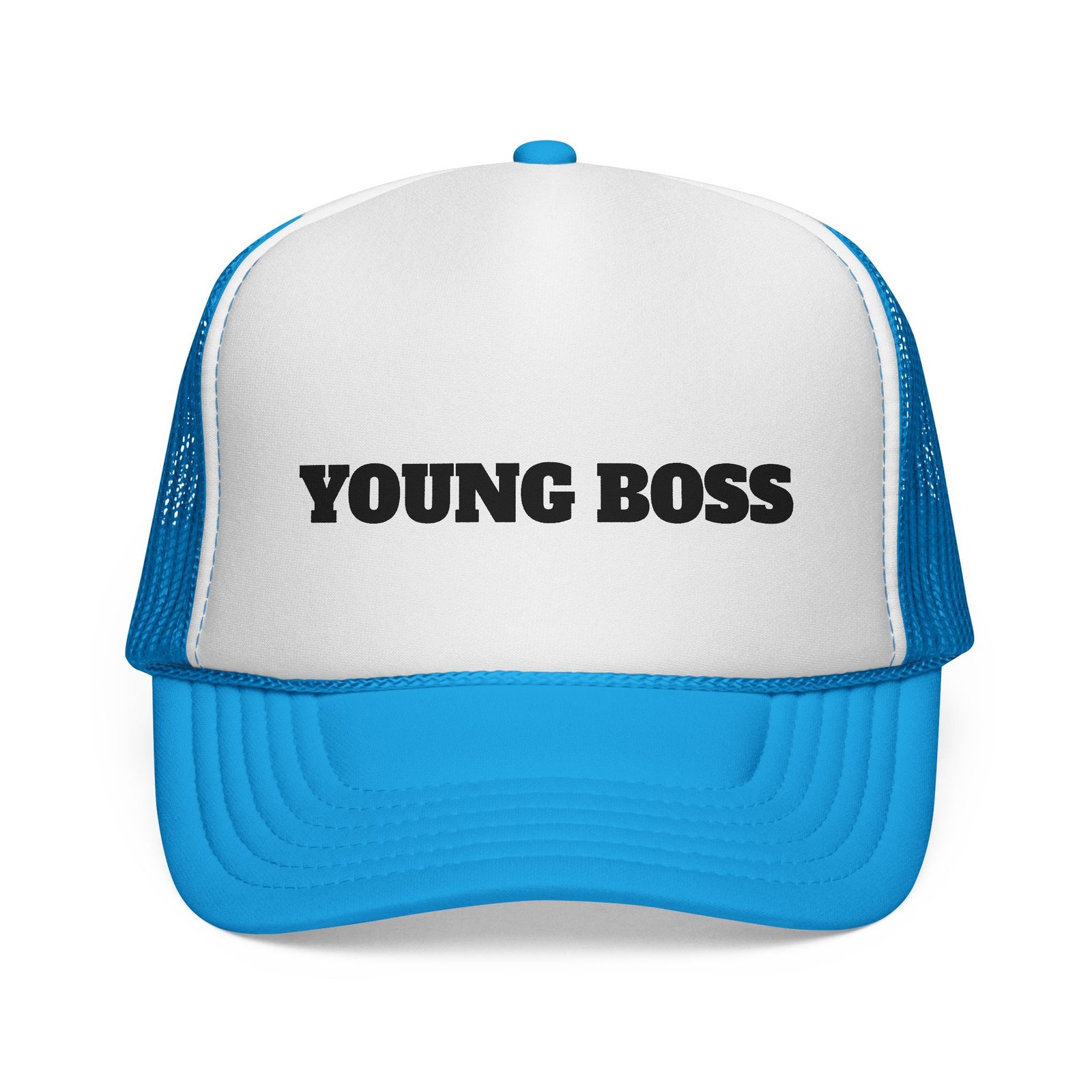 This trucker cap wears confidence lightly. The sculpted foam front holds a bold “young boss” face design that reads playful, sharp, and unapologetic — the kind of look that opens conversations before you say a word.